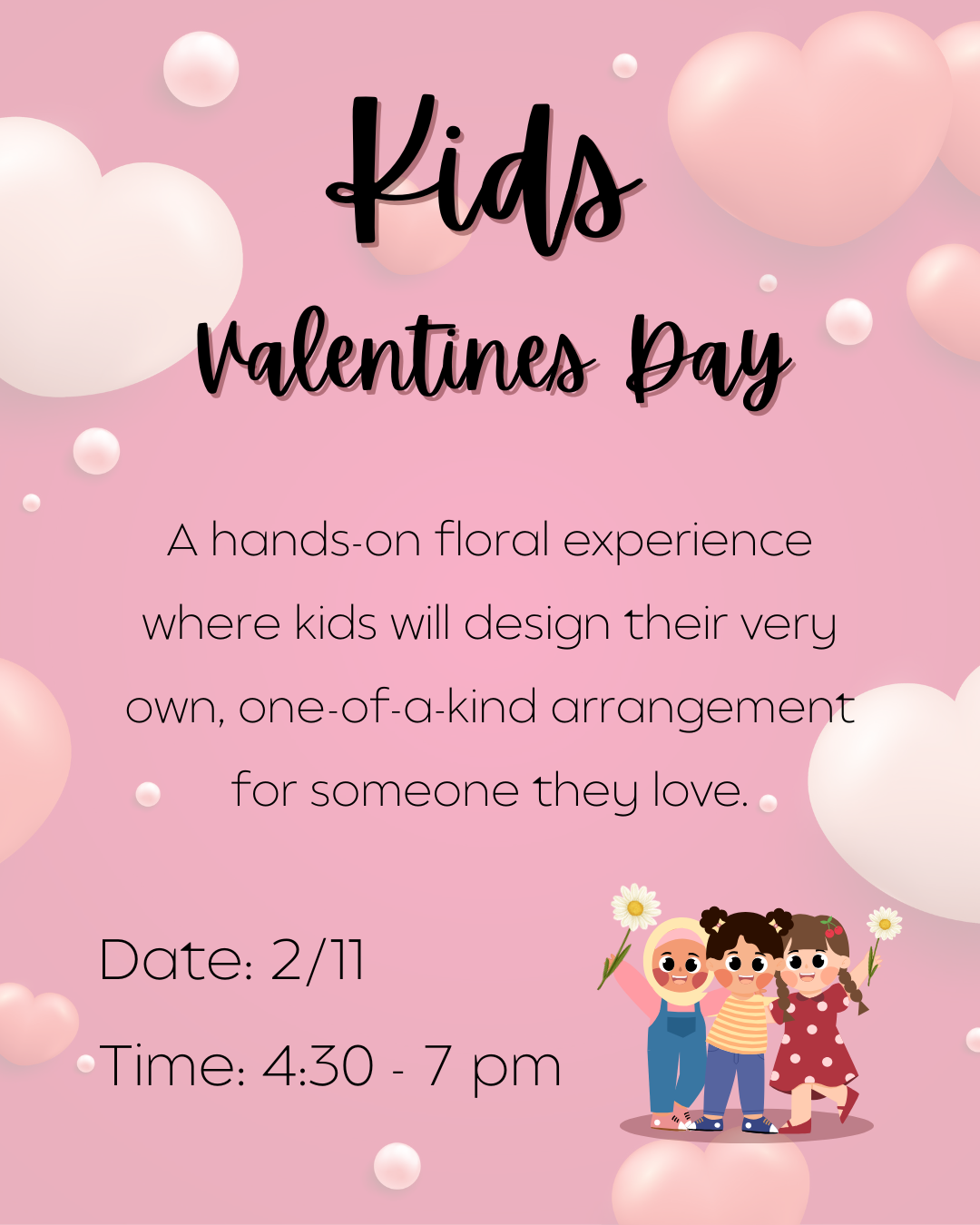 Let your little ones get creative this Valentine’s Day! Our Kid’s Valentine’s Day Make & Take is a hands-on floral experience where kids will design their very own, one-of-a-kind arrangement for someone they love. With guidance from our floral team, each child will choose from a selection of fresh blooms and learn how to create a beautiful design to take home and gift.